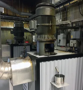 En av Allweilers stående skruvpumpar. Den övre runda trumman är motorn. Den undre vita lådan är isoleringen kring själva pumpen (som alltså inte syns på bild). Bitumen från depån kommer in från höger och pumpas via röret till vänster till kundens tankbil.