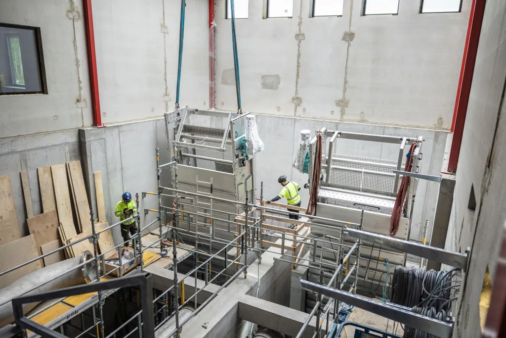 De båda rensgallren är dimensionerade för att kunna hantera de 2 000 liter vatten i sekunden som stålverket behöver i full drift. Gallren filtrerar bort kvistar, löv, sjögräs och annat skräp för att vattnet ska bli pumpbart. Även lekmannen förstår att det här handlar om rejäla pjäser: 13 meter höga, varav 7 meter ligger under vattnet, 2,5 meter breda och ett djup på 70-80 cm. Varje rensgaller väger omkring 5 ton.